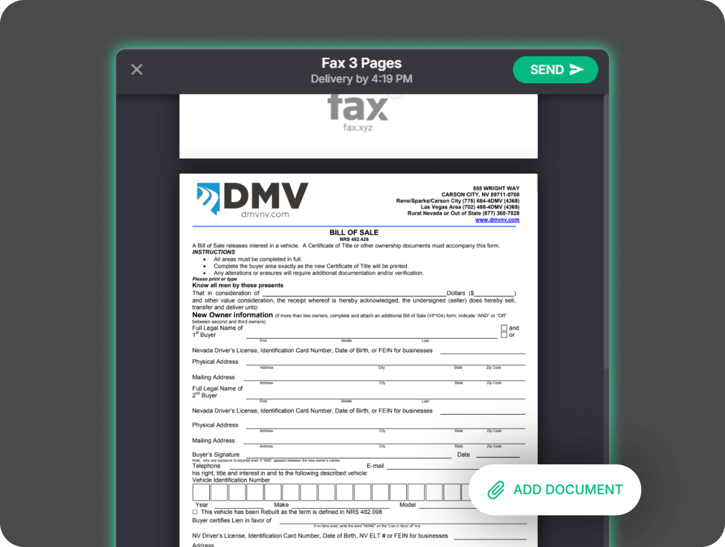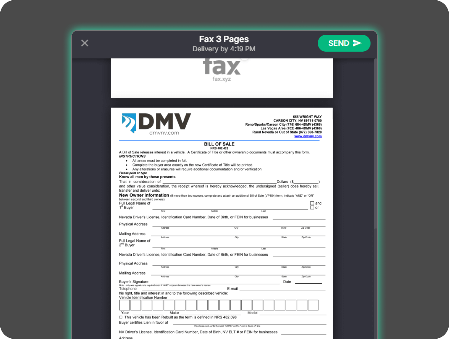 Don’t waste time printing, scanning, or waiting in line. Fax.xyz lets you send DMV documents instantly, with secure delivery and instant proof of submission.